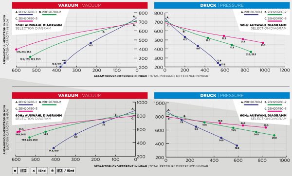 | Fréquence | Surpression limite (mbar) | Dépression, vide limite (mbar) | Tension alimentation en volt (V) | Courant en ampère (A) | Puissance moteur (kW) | Bruit (dB A)* | Poids | Indice Energétique |